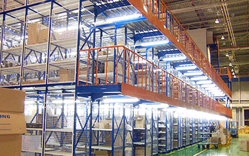 중량보관고의 Rack Frame(Rack Type)을 이용한다던가 독립적으로 H-Beam(Pole Type)을 사용하여 Main-Beam, Sub-Beam의 철골을 견고하게 연결하여 그위에 Floor Deck를 깔고 화물의 보관량을 높인다.